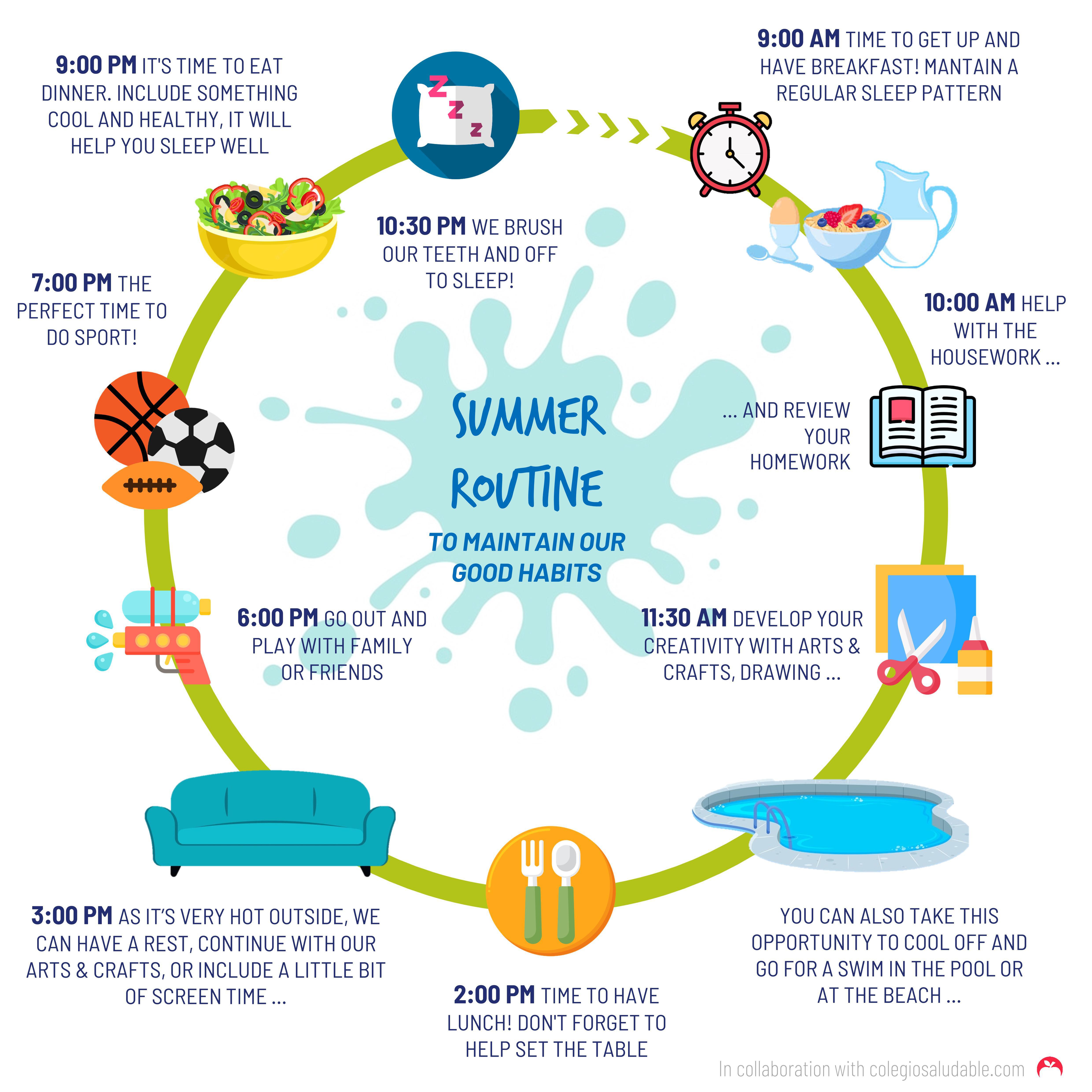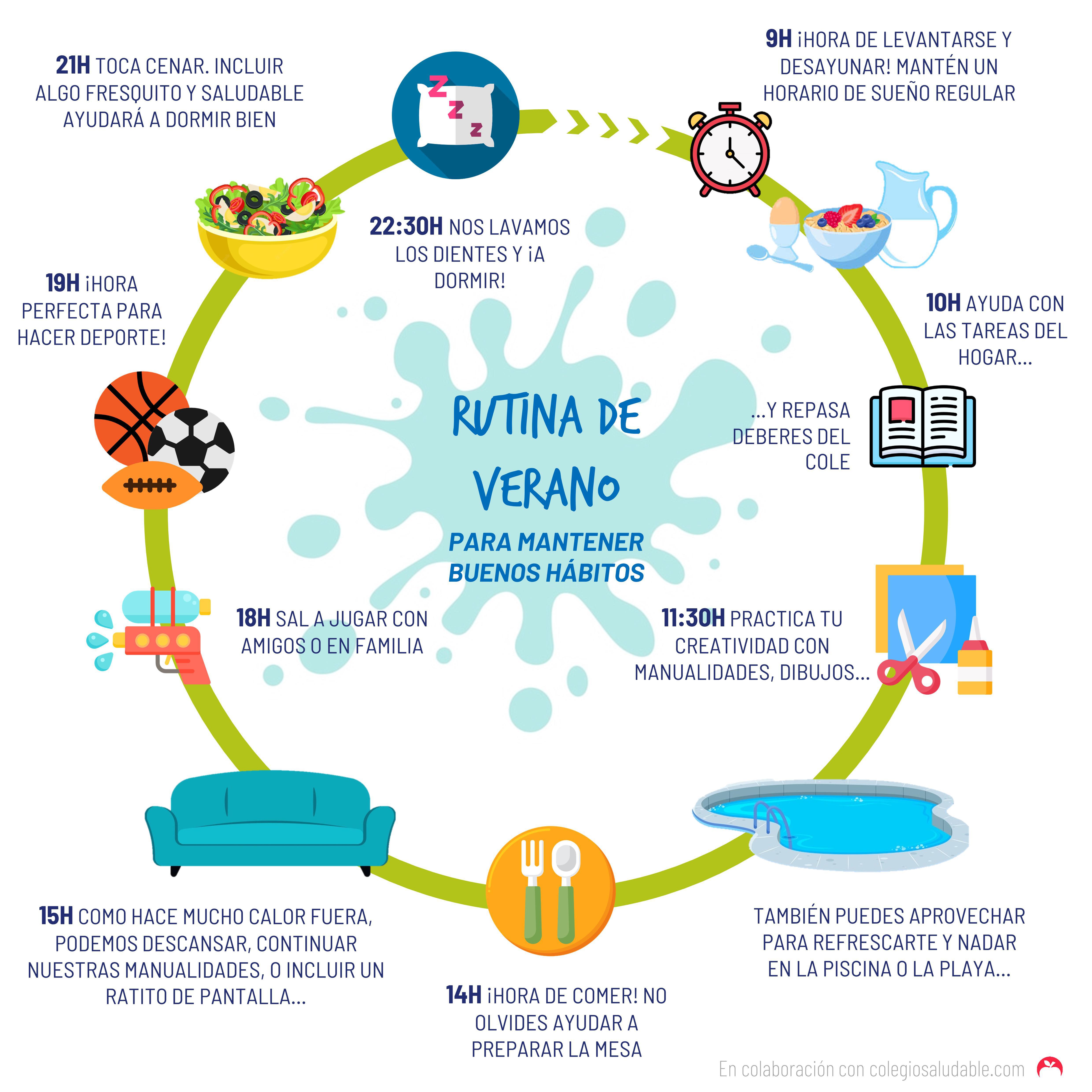Con el verano a la vuelta de la esquina se acercan las vacaciones escolares y con ello un cambio radical en las rutinas de toda la familia. Aunque es periodo de merecido descanso y disfrute, es importante establecer un plan y mantener ciertos hábitos con el fin de que no se pierdan ciertas costumbres aprendidas y sigamos fomentando el bienestar y la educación de los pequeños.