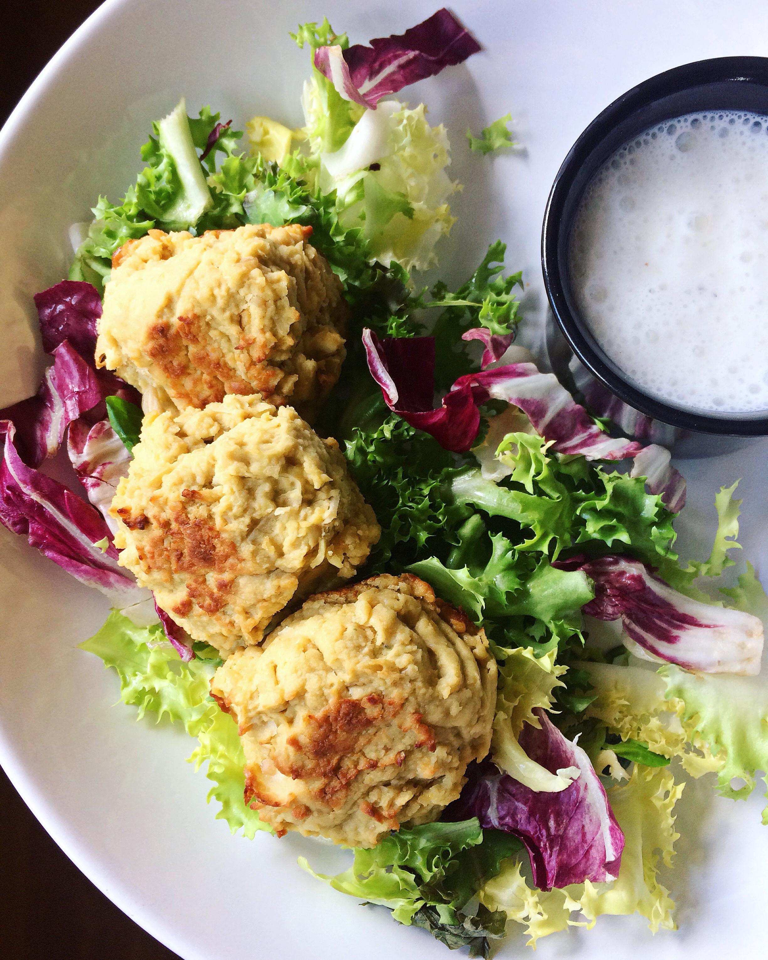 • Daremos forma a nuestras bolas de falafel para irlas colocando en la bandeja de horno forrada con papel vegetal. De manera opcional, podemos pasar las bolas por pan integral rallado o copos de avena, o copos de maíz, para ‘rebozarlo’ y que quede más crujiente, pero no es necesario (sin rebozar queda muy bien también)