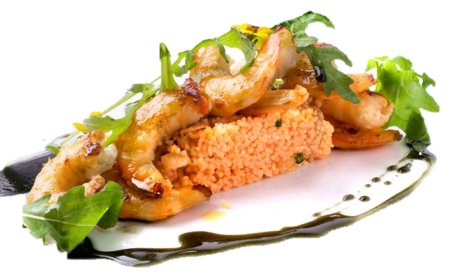 - Para servir, en un bowl o plato grande colocamos el cuscús, un poco de tinta (opcional) con los langostinos, y un puñadito de rúcula, todo ello acompañado de la salsa de clorofila.