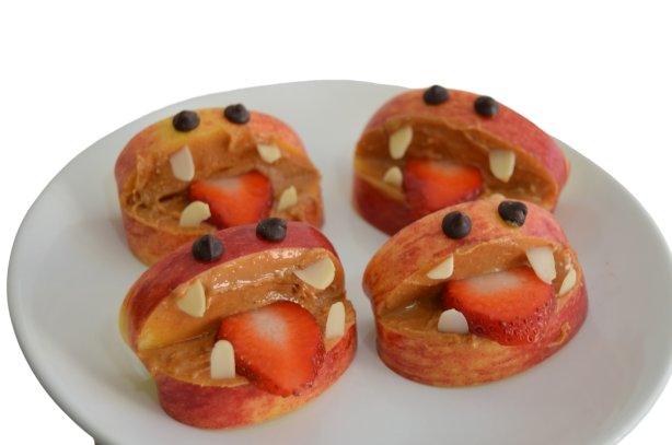 Lavamos y laminamos unas fresas (imagen 3). Colocamos entonces la fresa como si fuese la lengua, y clavamos los trocitos de almendra formando colmillos.