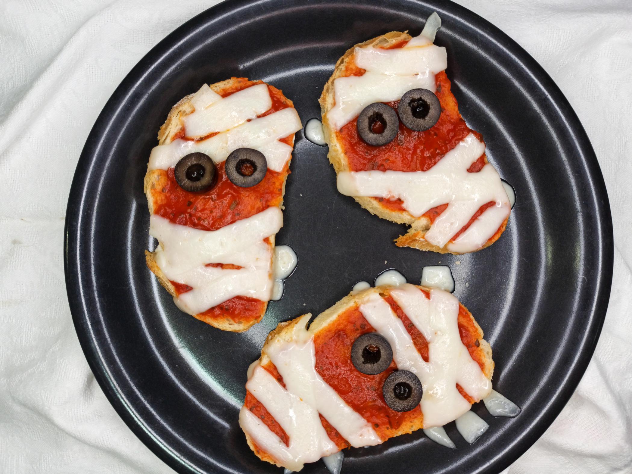- Cortamos el queso en tiras y las colocamos a modo de ‘venda’ de nuestras momias.