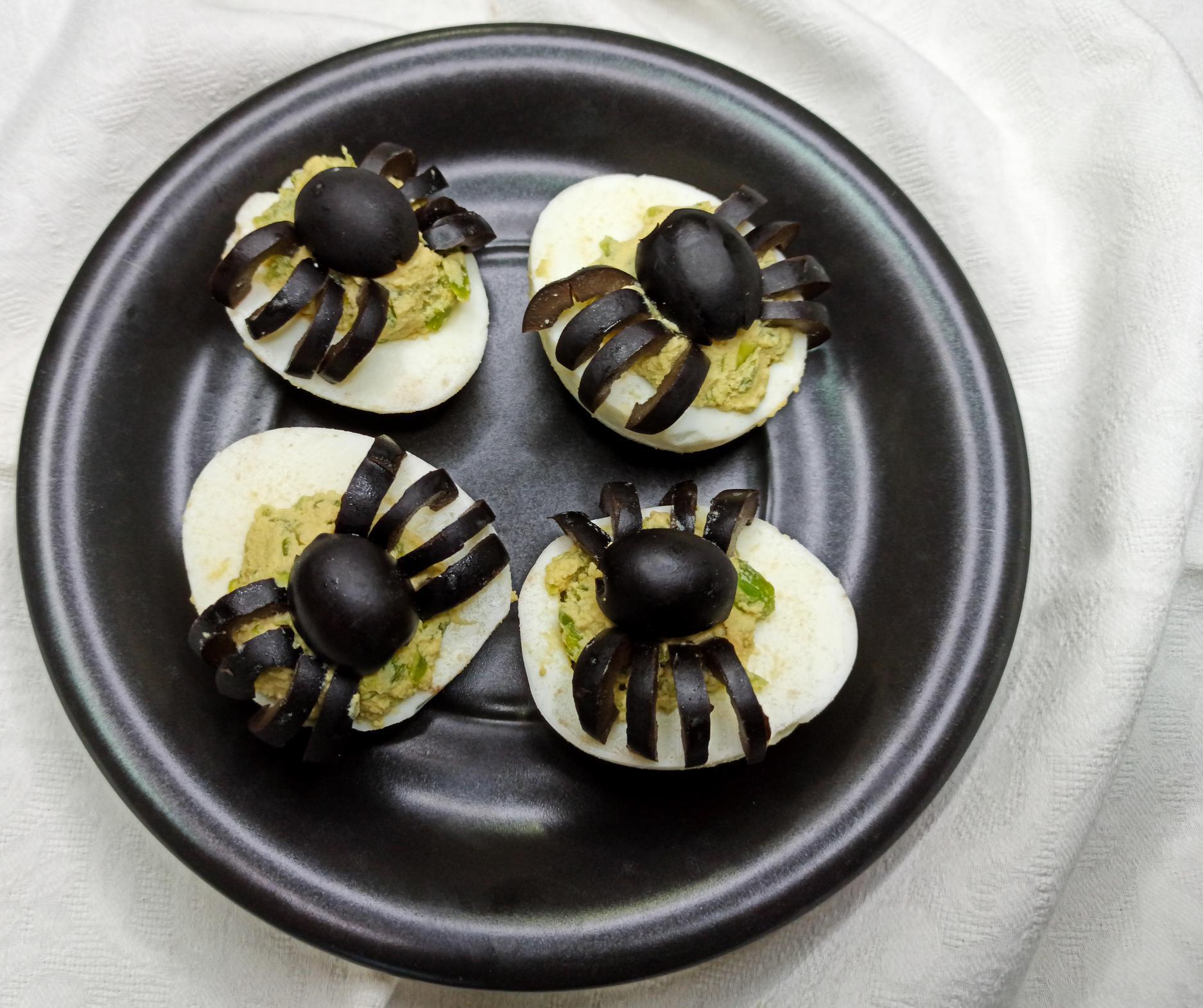 • Rellenamos los huevos con la mezcla, y colocamos las aceitunas formando nuestras arañas (por la mitad para el cuerpo y en medias rodajas para las patas)