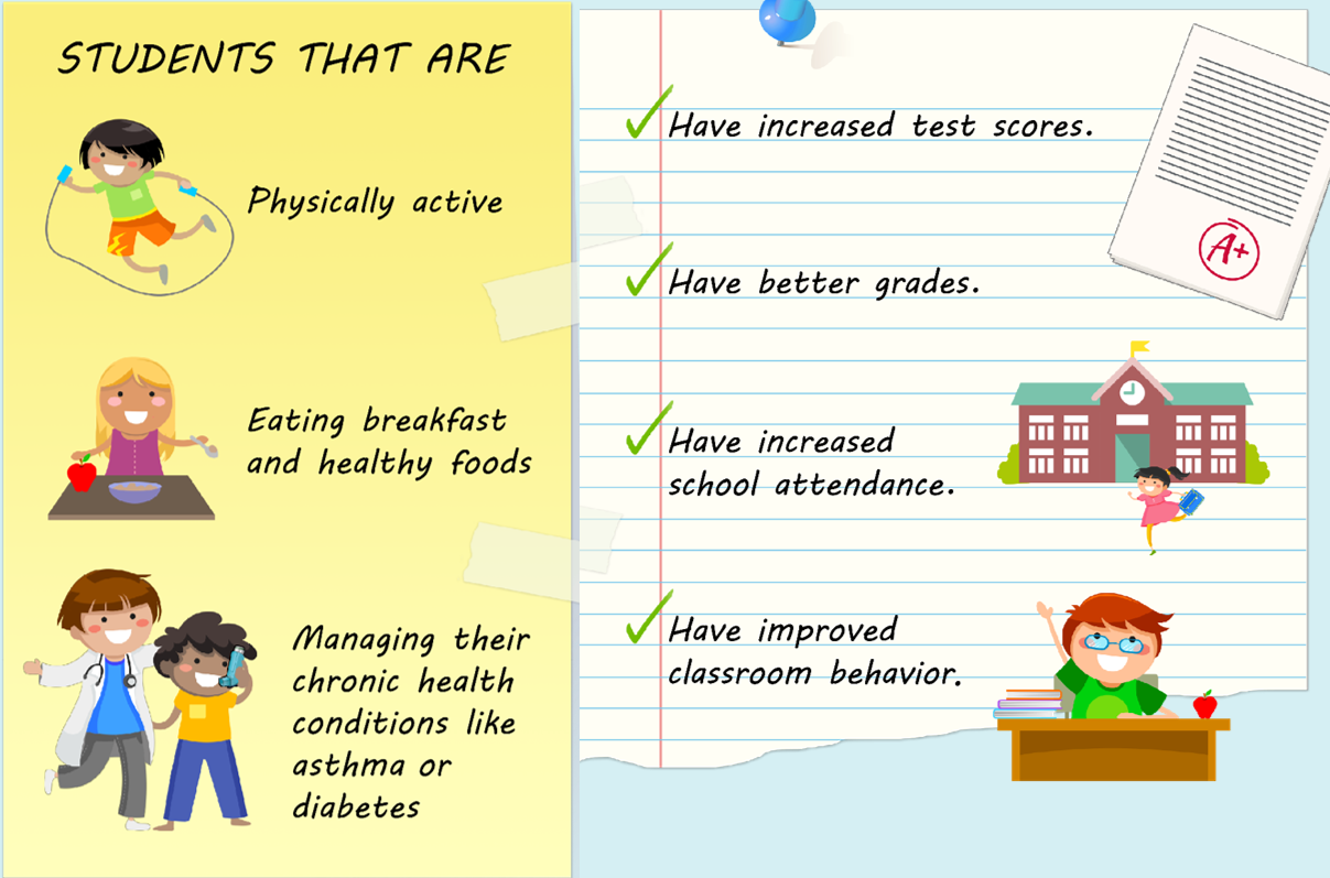 Los progenitores juegan un papel importante en el apoyo salud y bienestar de niños y adolescentes en casa y en la escuela. Cuando los padres están comprometidos en las actividades escolares de sus hijos, sus hijos obtienen mejores calificaciones, eligen comportamientos más saludables y tienen mejores habilidades sociales.